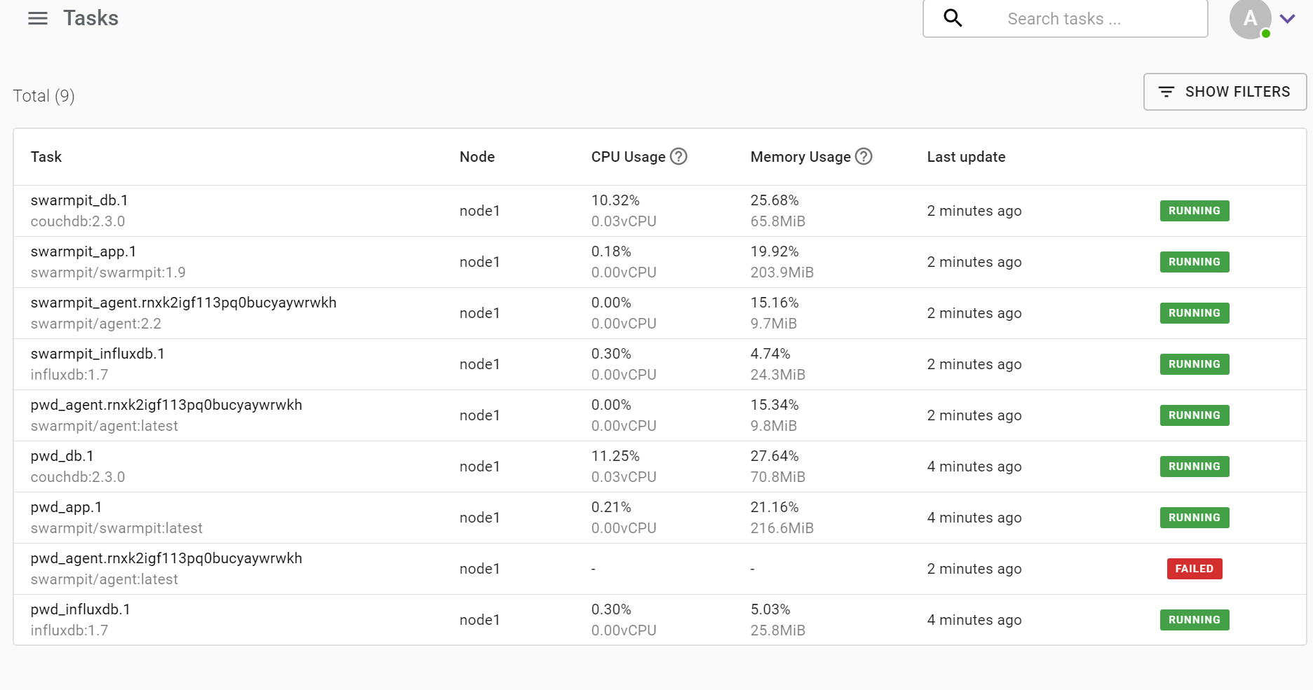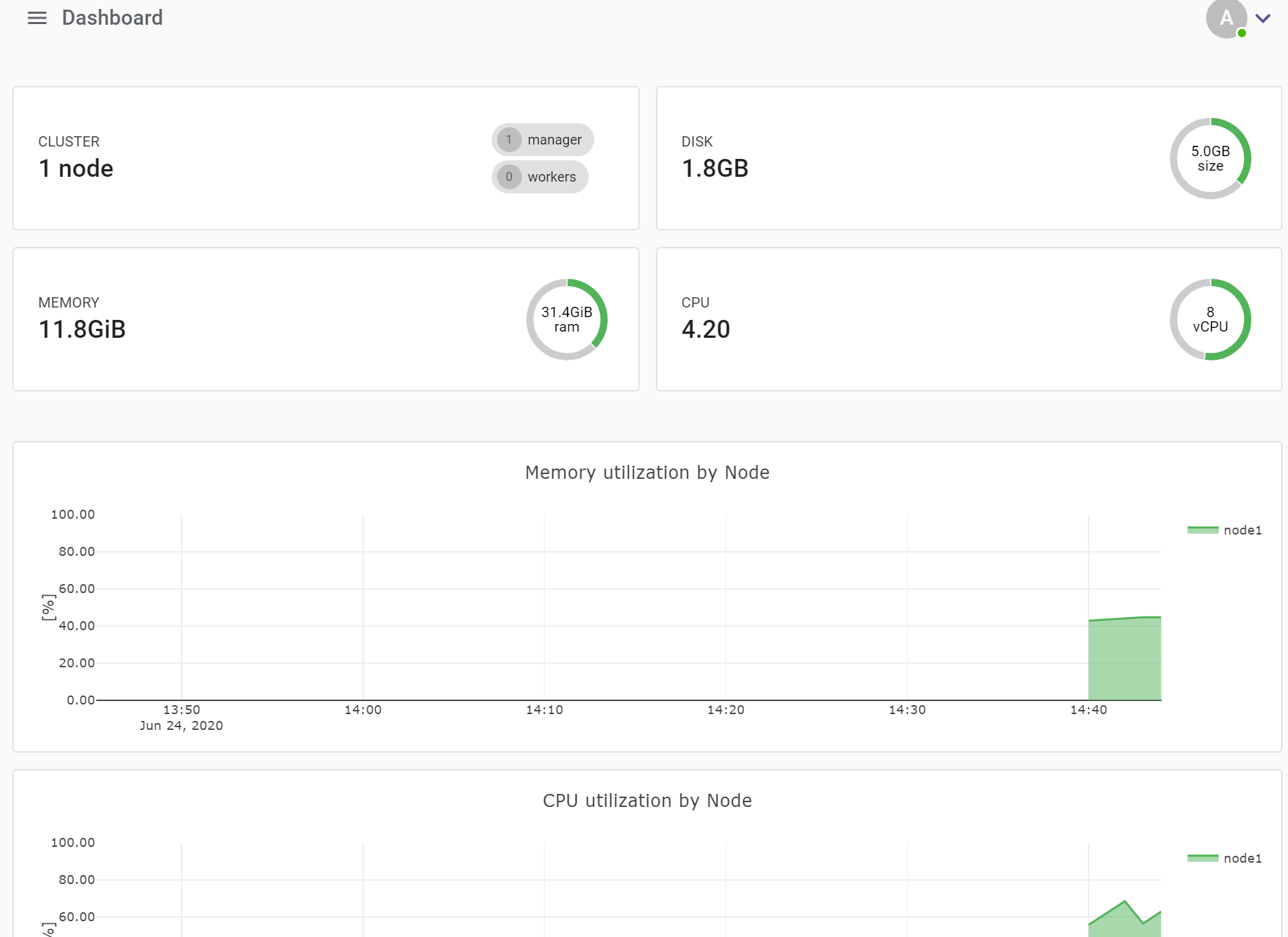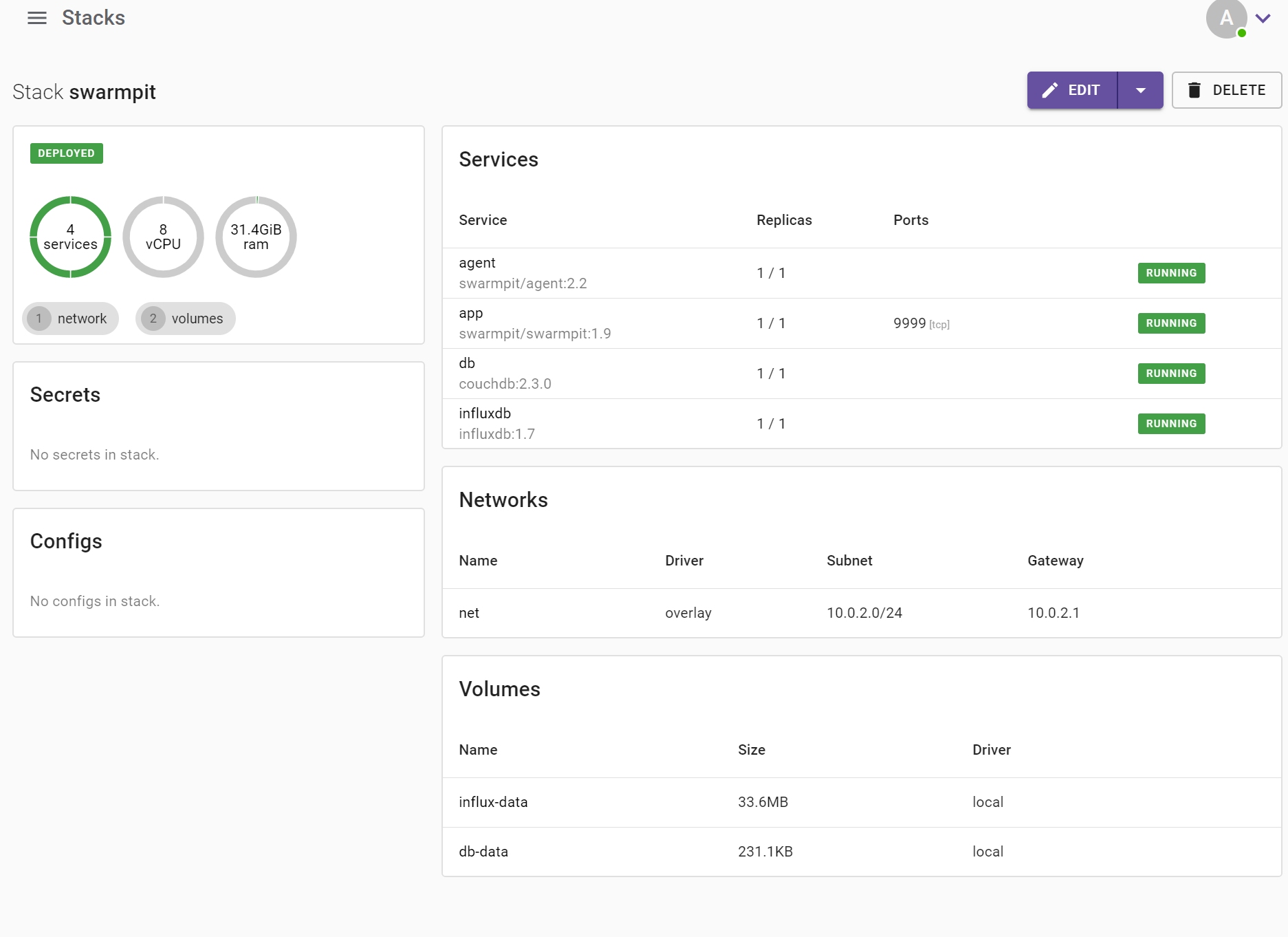 swarmpit도 도커 스택으로 구동되며 app, agent, db, influxdb의 4개 스택으로 구성됩니다. 구동 중인 swarm의 모니터링은 아주 화려하지는 않지만 확인하기 쉽도록 보여주며, UI상에서 새로운 스택도 구동 가능한 것처럼 보였습니다.