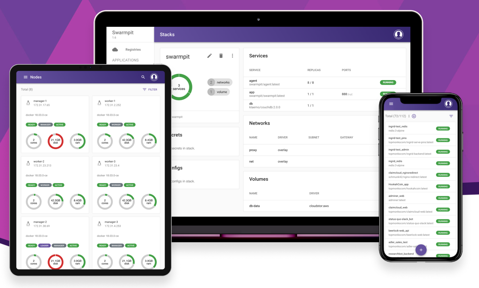 최근에 알게된 swarmpit( https://swarmpit.io/ ) 이라는 툴을 알게 되었고, swarm의 단점을 줄여줄 툴이 되지 않을까 하는 희망을 가지고 있습니다. 디자인도 나름 깔끔하고 각 노드에 실행되고 있는 스택과 서비스들을 쉽게 확인할 수 있습니다.
