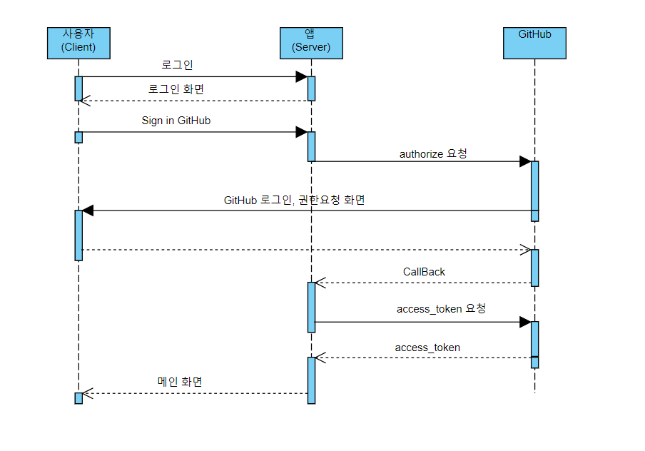 먼저 사용자는 우리가 만든 앱에 로그인하려고 할 것입니다. 그리고 앱에서 그린 로그인 화면에서 "Sign in with GitHub" 버튼을 누릅니다. 그러면 GitHub에 인증 요청을 보냅니다. 다음엔 GitHub이 사용자에게 GitHub에 로그인 화면을 보여준 후, 앱에서 인증 요청한 권한의 내용을 보여주며 허가할 것인지를 묻습니다. 사용자가 허가 한다면, GitHub은 앱의 Callback으로 정보를 보내줍니다. 이후 과정에서 access_token이 발급되고 사용자에게 세션을 만들어주는 과정을 거치게 됩니다.
