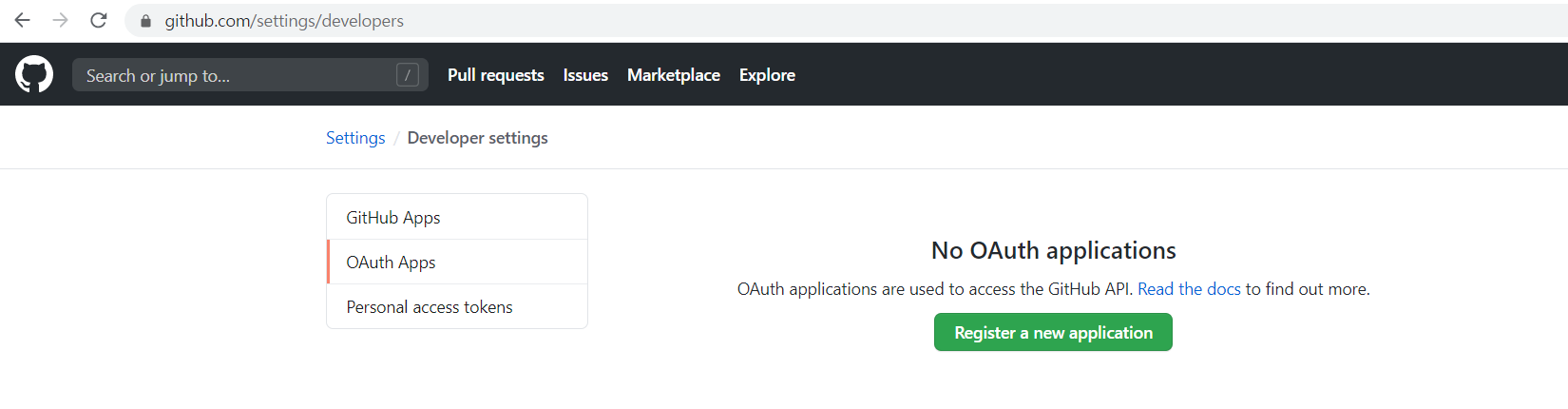 OAuth의 인증과정을 거친다고 모든 앱이 GitHub으로 인증하기를 할 수 있는 것은 아닙니다. 기능이 동작하기 이전에 우리가 만든 앱이 GitHub에 등록되어 있어야 하는데, 그 과정은 GitHub -> Profile -> Settings에서 Developer settgins화면 중 OAuth Apps를 통해서 등록을 해줘야 합니다.