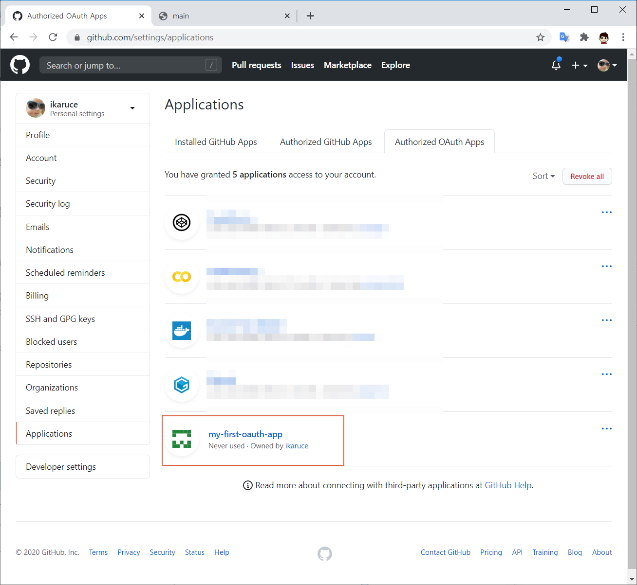 0. 아직 계정에 my-first-oauth-app은 등록되지 않은 것을 볼 수 있습니다.