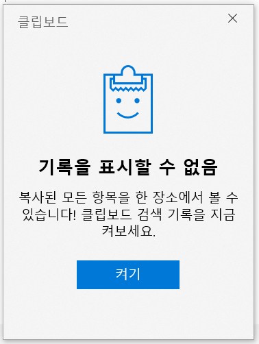 저는 요새 윈도우를 많이 사용하면서, 저거는 참 아쉬웠는데, 최근에 윈도우에도 비슷한 기능이 있다는 걸 알게되어 잘 쓰고 있습니다. 바로 윈도우10의 클립보드 기능인데요. Ctrl + C로 복사한 후, Ctrl + v 대신 윈도우+v를 누르면 클립보드이력을 볼 수 있습니다. 윈도우10 기본설정은 클립보드 검색기록을 사용하지 않도록 되어 있으므로, 처음 실행하면 클립보드 검색기록을 사용하겠냐고 묻습니다.