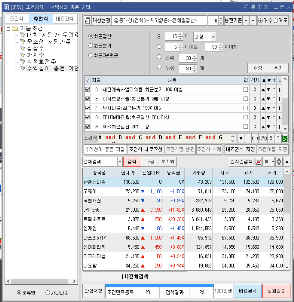 방법은 먼저 조건 검색을 통해서 나의 전략에 맞는 주식을 골라냅니다. 여기서는 키움증권에서 제공하는 추천식 중 수익성이 좋은 기업을 골라보도록 하겠습니다. 조건은 영업이익율과, 세전계속사업이익률, 이자보상배율, 부채비율, EBITDA, ROE를 기준으로 검색하는 조건입니다.