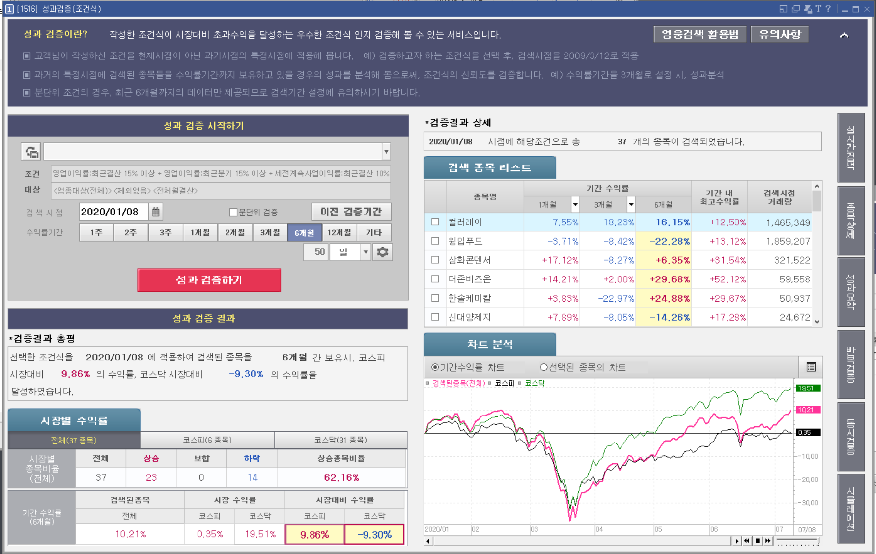 나오는 화면에서 수익율 기간을 선택하고 성과 검증하기를 누르면, 확인할 수 있습니다. 1월 8일 기준으로 37개 종목이 골라졌고, 이중 23개 종목이 상승하였다는 것을 알 수 있습니다. 그리고 만약 위 종목에 투자했다면, 즉 1월 8일에 37개 종목을 구입해서 6개월 보유했다면 10%의 수익을 냈고, 이는 코스피 대비 10% 이익, 코스닥 대비 10%정도 손해를 봤다고 예측할 수 있습니다. 이런식으로 내가 만든 전략에 대해 테스트를 해본다면, 나에게 맞는 투자 전략을 세우고 검증할 수 있을 것입니다.