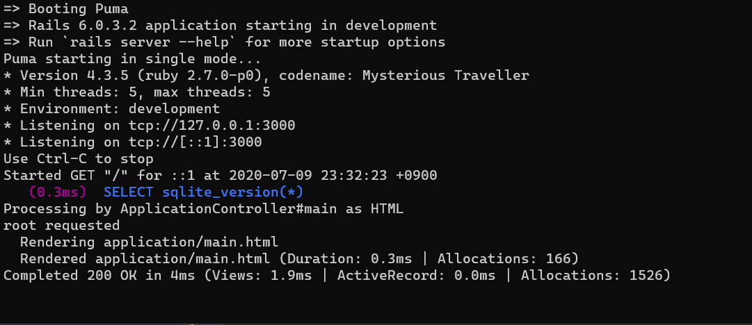 그런데, 여기서 한가지 궁금증이 더 생겼습니다. 여태 것 파비콘 요청 때문에 문제가 됬던 기억이 없는데, Rails에서는 어떻게 처리를 할까? 궁금했습니다. 그래서 해봤습니다. 그냥 간단히 rails 앱을 하나 만들고 / 로 시작하는 route를 하나 만들었습니다.
