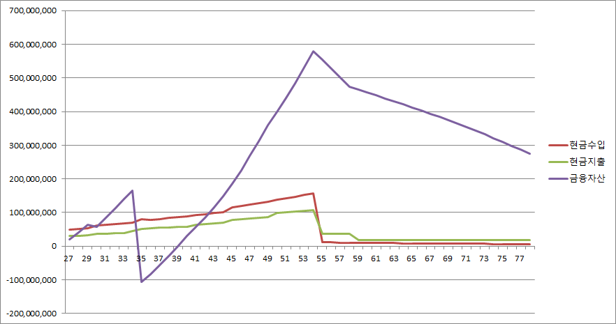 - 지출 : 현재 기준으로 급여의 70%를 사용하고, 잔여금액은 금융자산에 편입합니다. 그리고 은퇴 후에 받는 연금 예상액을 고려하야 마지막 급여의 20%를 지출한다고 가정합니다.