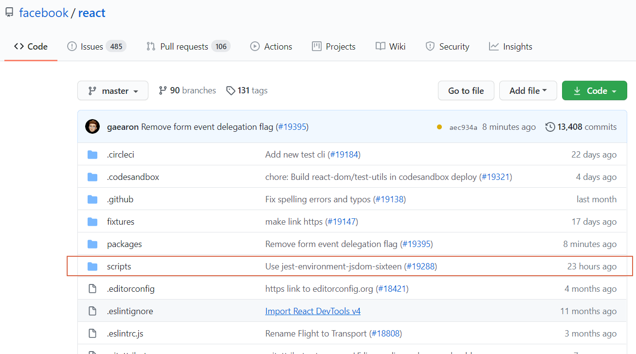 React 리파지토리의 디렉토리 중 scripts 폴더만 가져오는 것을 예제로 각각 어떻게 하는지 알아보겠습니다.