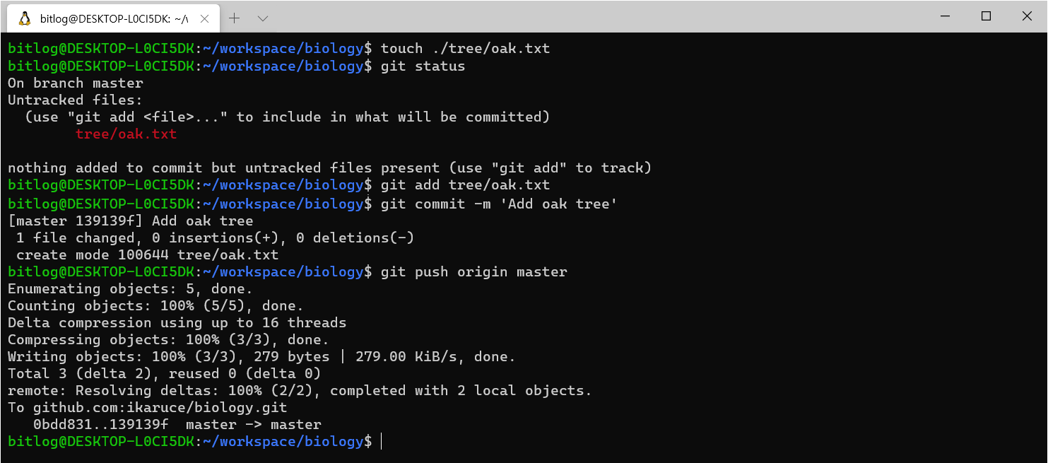 1. biology 리파지토리에서 tree 폴더 아래에 oak.txt를 추가하고 push