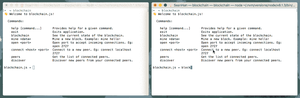 "👋 Welcome to Blockchain CLI" 라는 메시지와 함께 프롬프트가 "blockchain →"로 변경되어 명령을 실행할 준비가 된 것을 볼 것입니다.