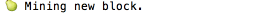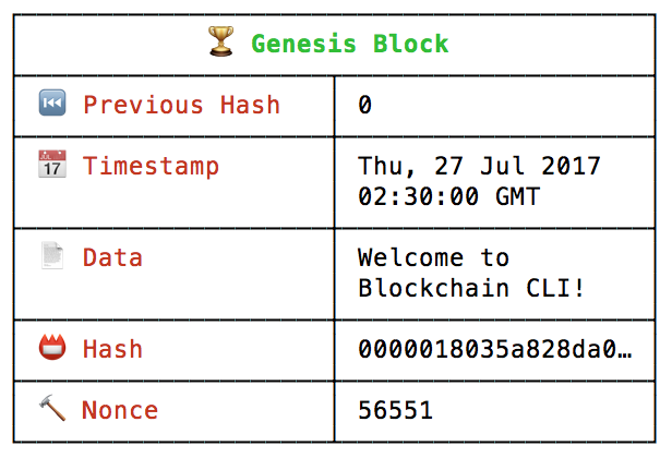 현재가지고 있는 블록체인을 확인하려면, blockchain 또는 bc 를 프롬프트에 입력하세요. 아래 그림과 같은 블록 정보를 볼 것입니다.