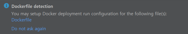 전지 전능한 JetBrains IDE에서는 Docker도 당연히(?) 사용할 수 있습니다. 그래서 Dockerfile이 발견되면, 아래와 같은 풍선 도움말을 통해 Docker 설정을 할 수 있도록 도와줍니다.