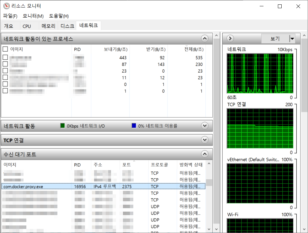 열린 포트를 확인하는 방법은 "작업관리자 -> 성능"화면 하단에 "리소스 모니터 열기" 버튼을 클릭하여, 네트워크 탭에 접속하면 됩니다. 하단에 수신 대기 포트 중 아까 오픈한 2375번 포트가 있는지 확인하실 수 있을 겁니다.