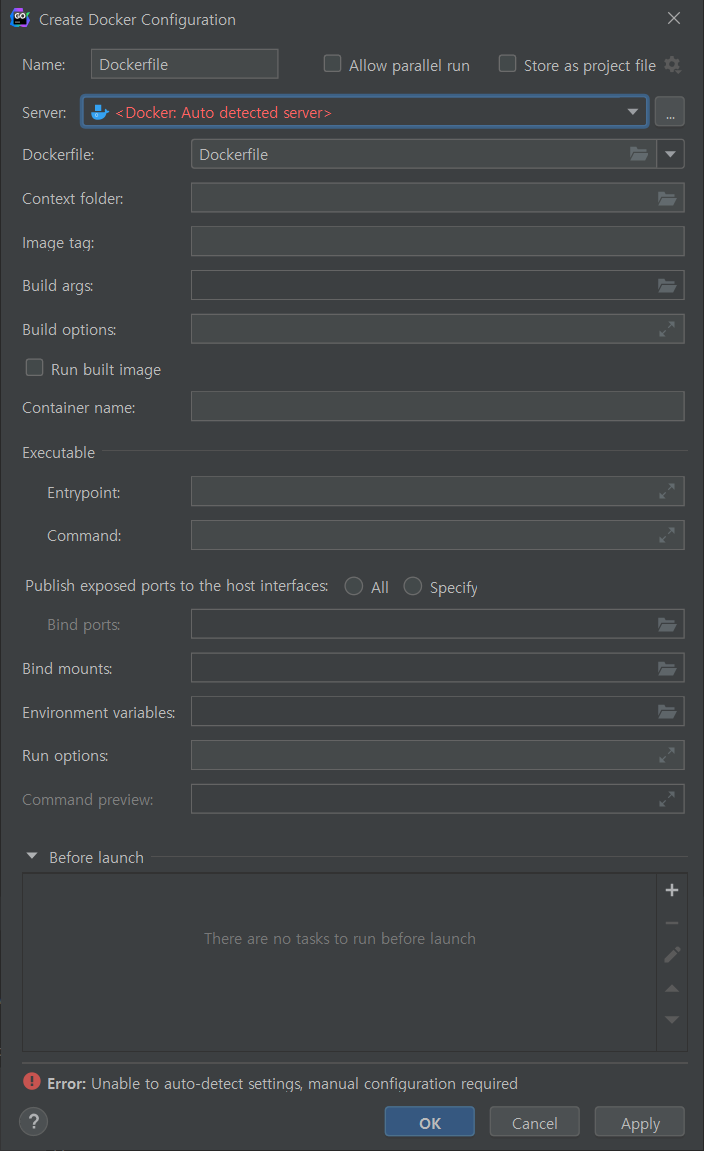 Docker 설정에는 구동할 Dockerfile 명, 컨텍스트 폴더, 태그, 빌드할 때 필요한 옵션들 그리고 빌드된 이미지를 실행할 때 필요한 옵션을 지정할 수 있습니다. 설정하려고 보니 Server 부분에 자동으로 탐지할 없다는 붉은 색 메시지가 보입니다. 저는 윈도우즈10에서 wsl을 이용해 Docker를 사용하고 있기 때문에 안되나보다 하고 넘기고 있었는데 오늘은 무슨 생각에선지, 서버 옆에 설정버튼을 눌러봤습니다.