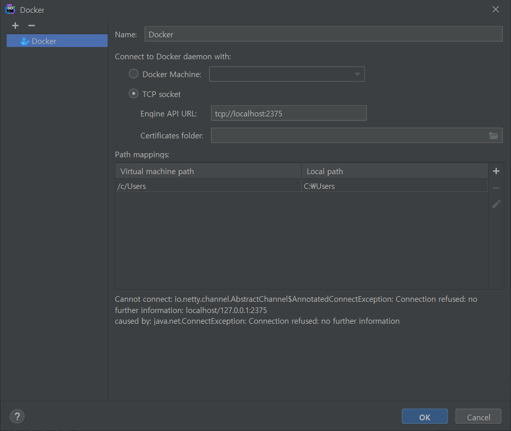 서버 설정 팝업이 나오고, 그 팝업을 통해서 tcp://localhost:2375에 연결할 수 없다는 메시지를 보았고, wsl로 띄워서 저 포트에 연결할 수 없는건가? 하다가 Docker 설정을 살펴보니,