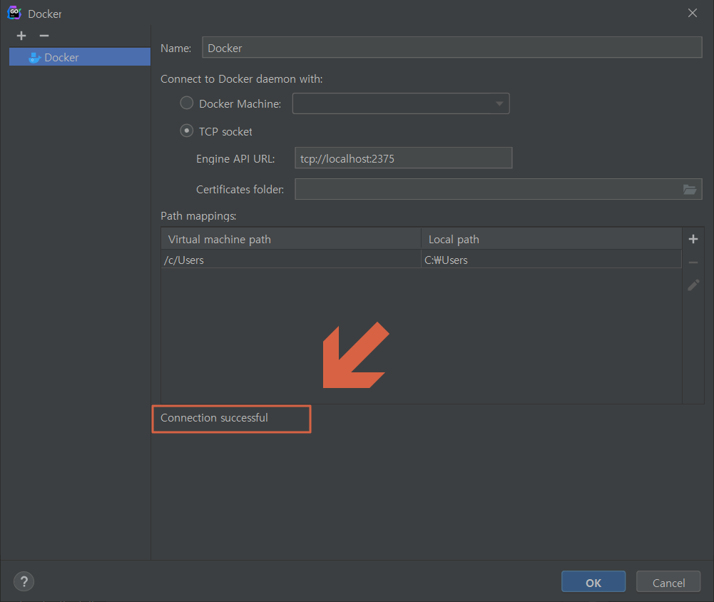 설정을 마치고 나면, 드디어 IDE에서 Docker Daemon에 접속할 수 있습니다.