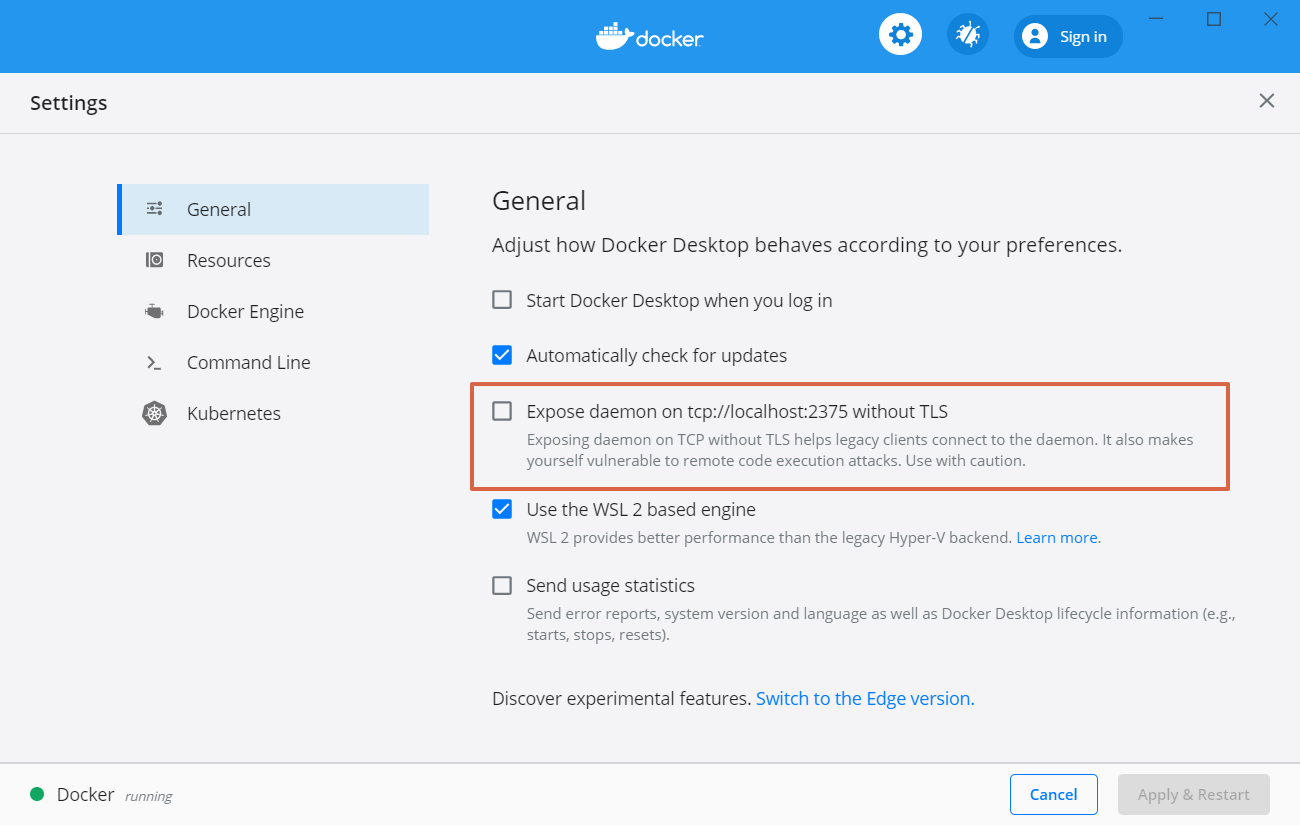 리눅스에서와는 달리 2375 포트가 오픈 되지 않은 것을 발견했습니다. 저걸 제가 꺼놓지는 않았을 테고, 밑에 경고 메시지가 있는 걸 보니, 윈도우에서는 2375포트를 열지 않는게 기본 설정인가 봅니다. 체크박스를 눌러서 설정을 켜고 Docker를 재시작 해줍니다.