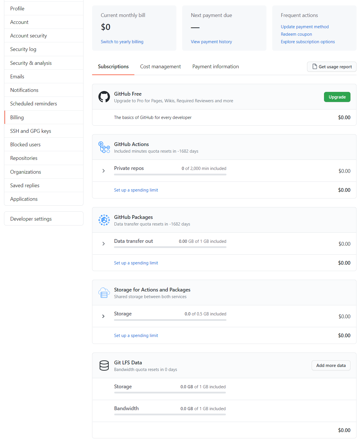 과금 되는 항목은 리파지토리, 액션, 패키지, 액션과 패키지를 위한 스토리지, LFS가 있습니다. 각 항목에 대해서 현재 사용량을 보여주고, 우측 상단에 있는 "Get usage report" 버튼을 클릭하면 최근 7일, 30일, 90일, 180일의 사용량 보고서를 메일로 받을 수도 있습니다. 저 같은 경우, 과금될만한 사용을 전혀 하고 있지 않은 것을 알 수 있습니다. 그럼 각 항목 마다 어느정도 제한을 받고 사용량이 계산되는 지 알아보겠습니다.
