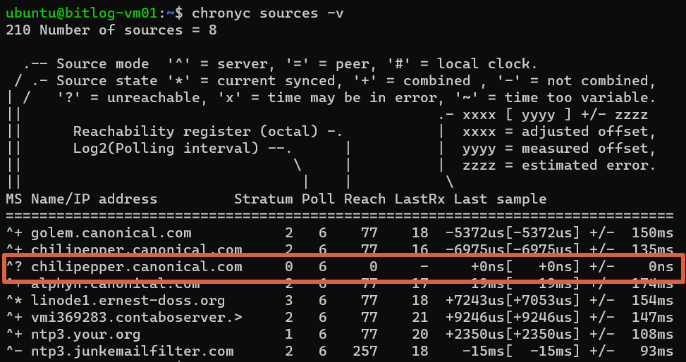 $ chronyc sources -v