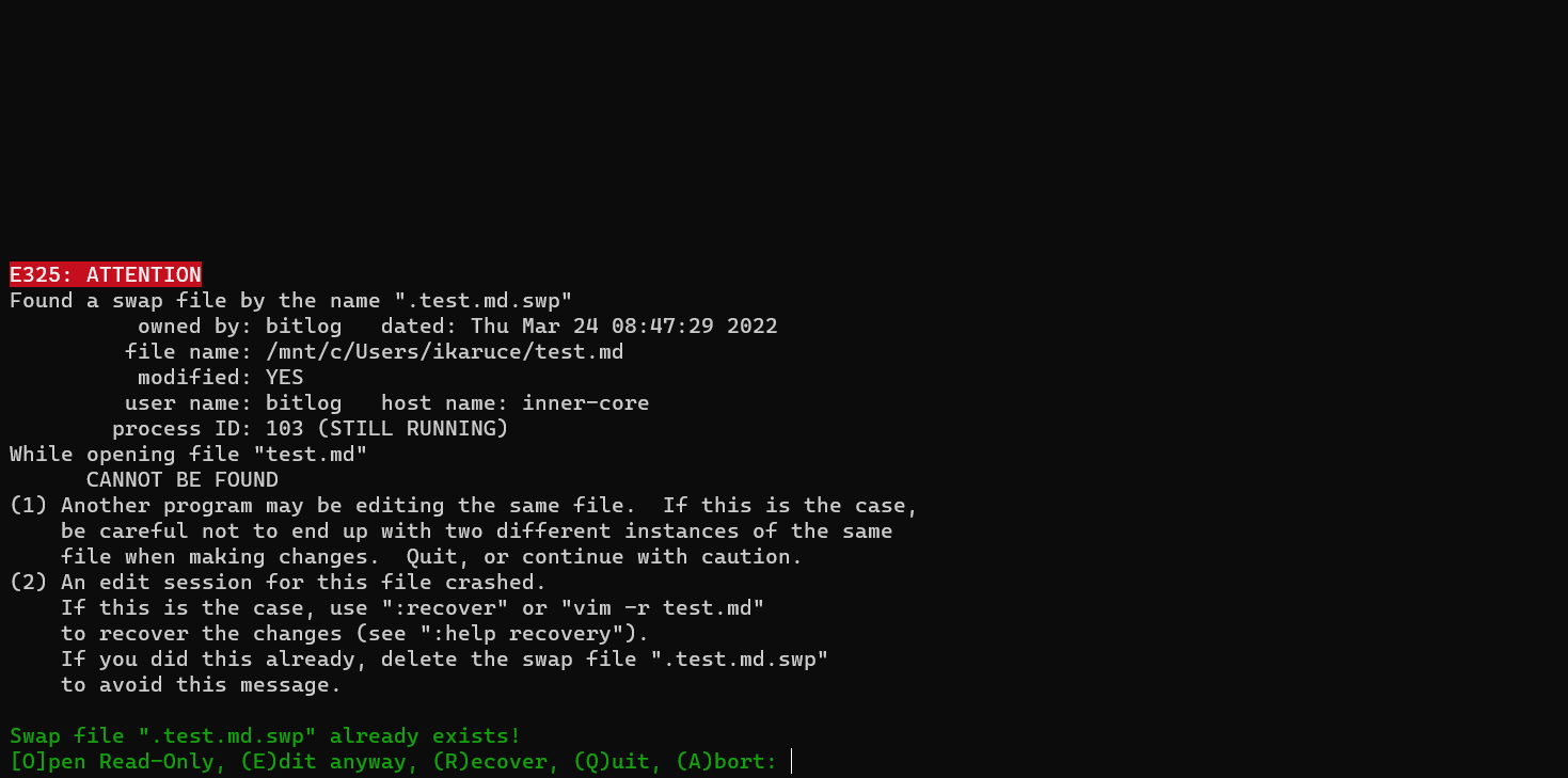 이때 프로세스가 종료된 것으로 알고, 편집 중이던 파일을 다시 열게 되면 이미 파일을 편집 중이라는 경고가 뜨게됩니다.