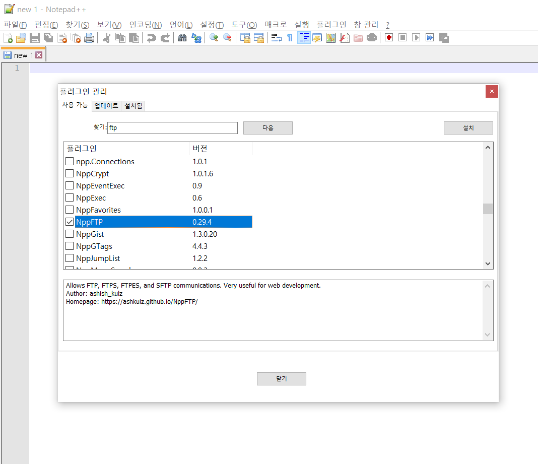 플러그인 -> 플러그인 관리를 실행하고 ftp로 검색하여 NppFTP플러그인을 설치합니다.