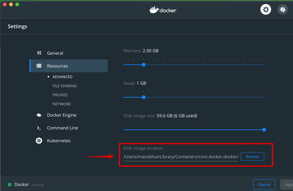 간혹, Resources에 ADVACED라는 메뉴가 보이지 않는다고 하시는 분이 계셔서 내용 추가합니다. 만약 윈도우즈에서 WSL2 통합 기능을 사용하시다면 위 메뉴는 보이지 않습니다. 이 때는 WSL2 볼륨을 사용하는 것 같고, (공식적으로는) 위치를 변경할 수는 없는 것 같습니다.