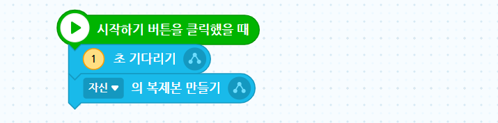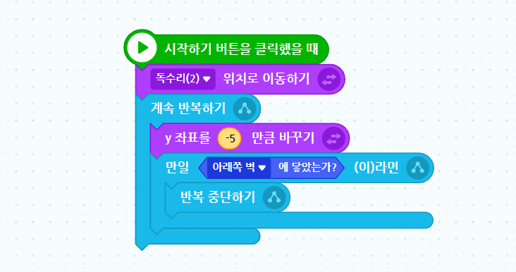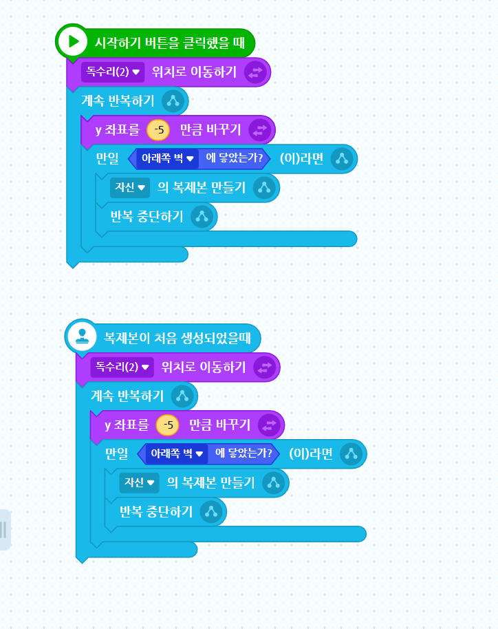 1. 아랫쪽 벽에 닿았을 때 자신의 복제본을 만들도록 해줍니다. 그리고 복제본이 처음 생성되었을 때 블록을 추가하여, 복제본에 대한 행동을 추가해 줍니다. 복제본에서도 마찬가지로, 독수리의 위치로 이동하고 아랫쪽 벽에 닿았을 경우 복제본을 만들도록 합니다.