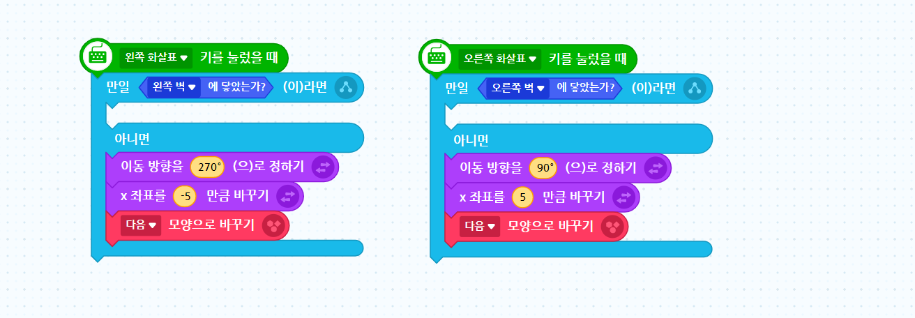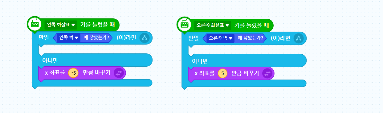 2. 이제 키를 눌렀을 때 블럭 두개를 추가하고, 키를 각각 왼쪽 화살표, 오른쪽 화살표로 변경해 줍니다. 그리고 이동을 표현하기 위해, x좌표를 더하고 빼주도록 합니다. 그리고 실행해서 왼쪽 오른쪽으로 잘 이동하는지 확인합니다.
