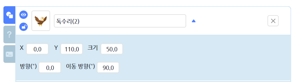2. 독수리의 크기를 50%로 조절하고 독수리가 하늘에서 움직이도록 Y좌표를 110으로 이동해 줍니다.