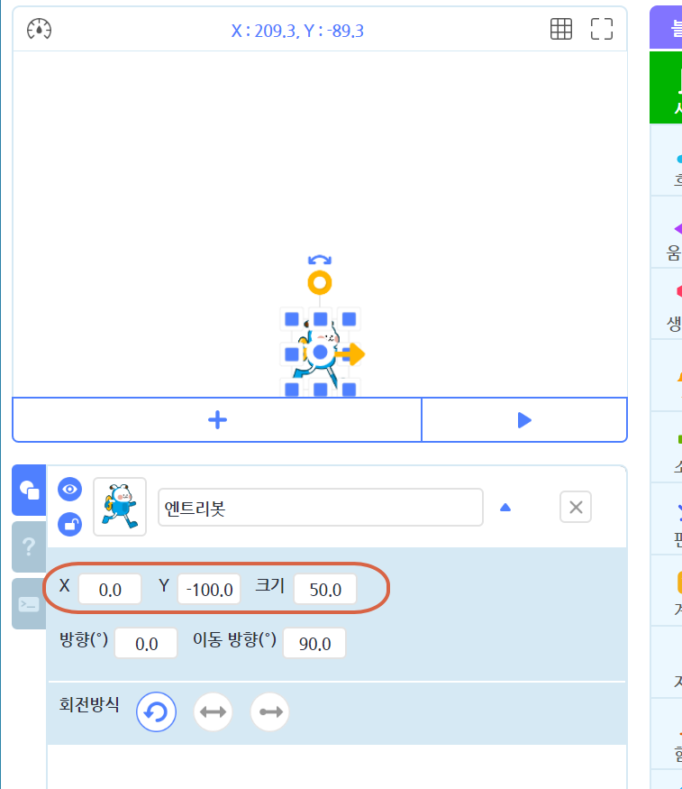 1 엔트리 봇이 땅에서 움직이도록 Y 좌표를 -100으로 변경하고, 크기를 50으로 변경합니다.