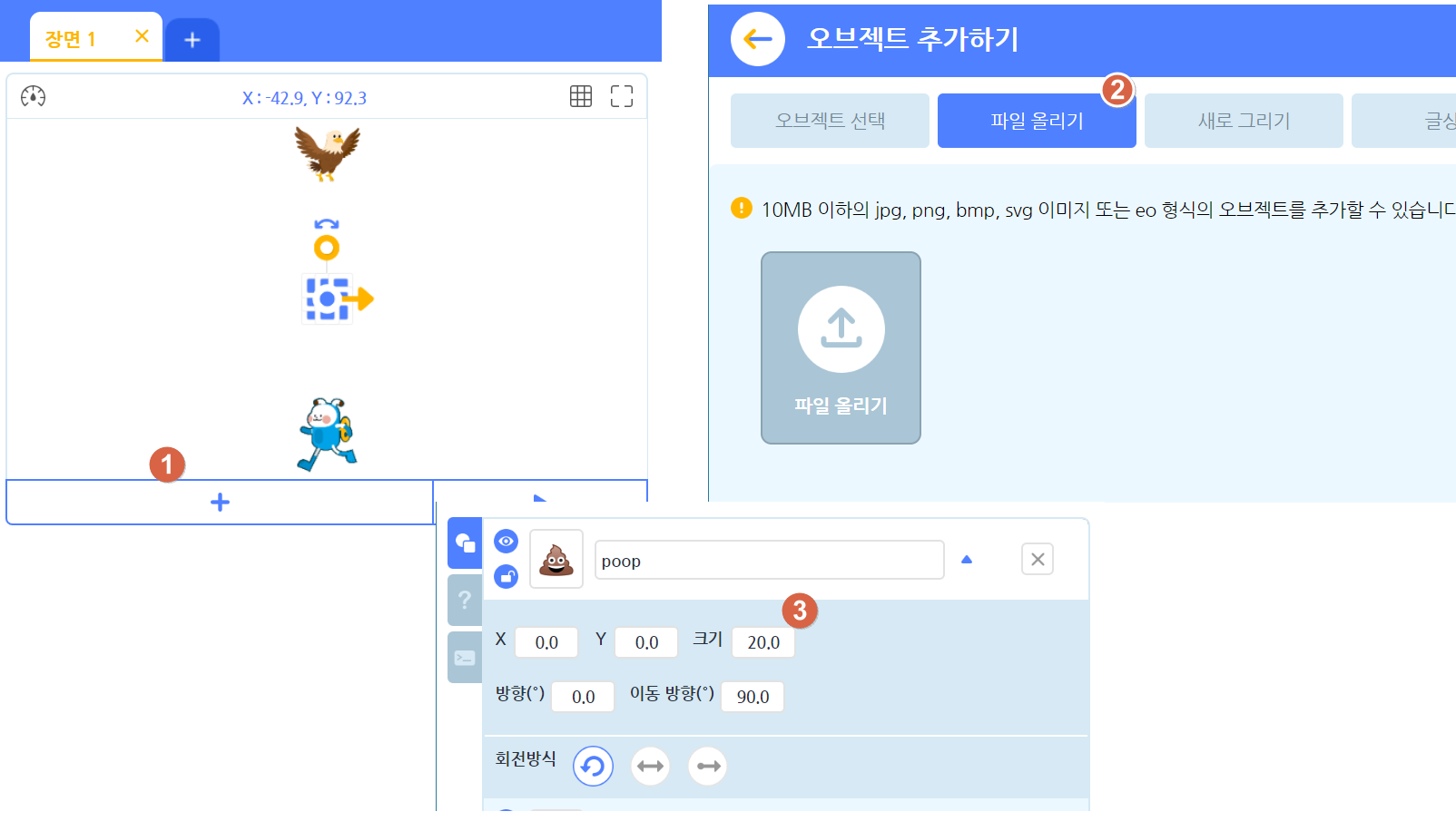 1. 오브젝트를 추가하기 창에서 파일 올리기를 통해서 오브젝트를 추가합니다. 추가하고 오브젝트 이름을 'poop' 라고 정하고 크기를 20으로 변경해 줍니다.