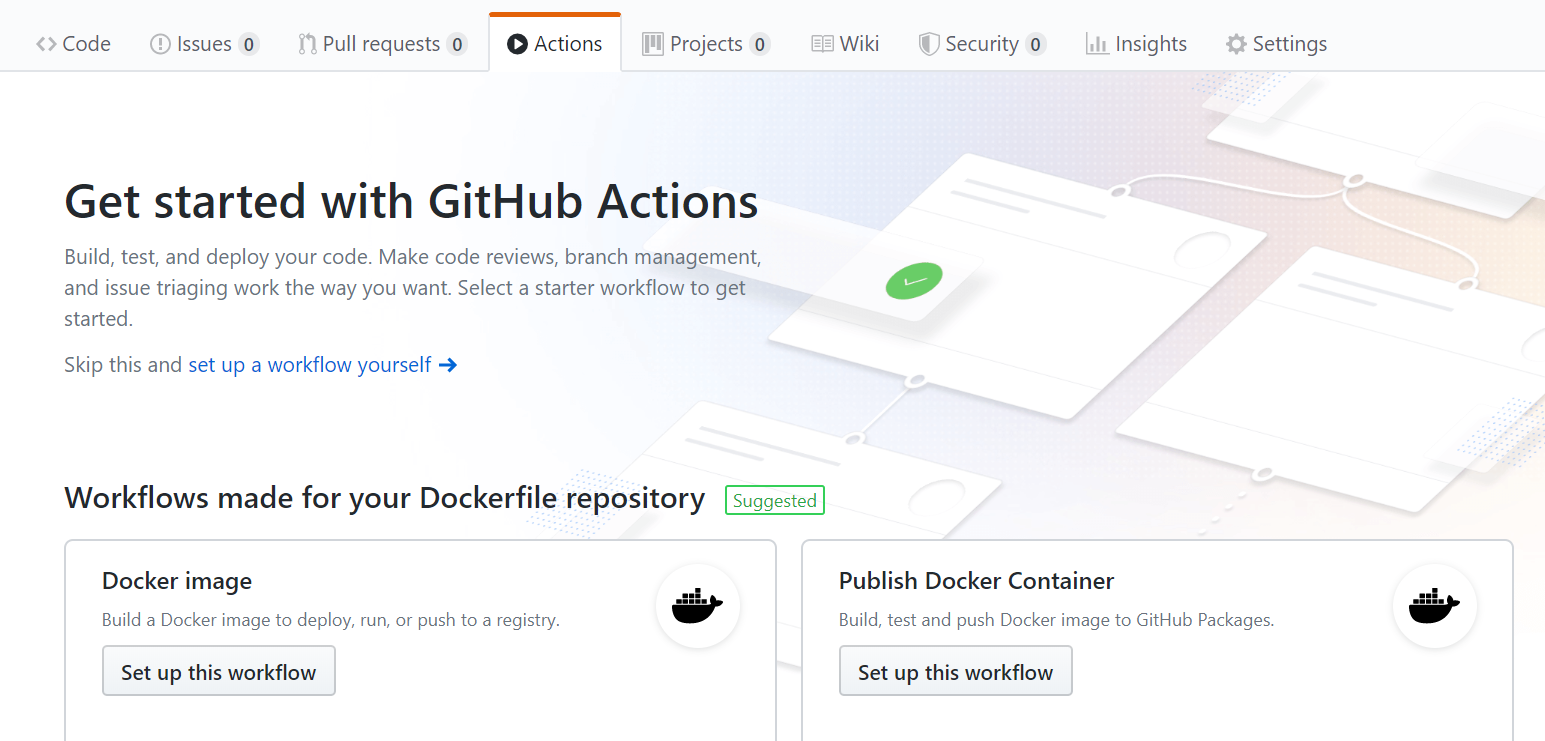 GitHub 에서 제공하는 CI/CD를 관리할 수 있는 Workflow를 정의할 수 있는 기능이라고 할 수 있습니다. 즉 빌드, 테스트, 배포 등을 수행할 수 있는 기능입니다. Action이 있기 전까지는 Travis나 CircleCI, Jenkins를 이용해야 했었습니다만, 이제는 간단한 클릭 몇 번 만으로 기능을 넣을 수 있습니다. 물론 빌드 배포를 위한 Workflow를 정의해야 하지만, GitHub 답게 웬만한 Workflow는 Market Place에 있는 것 같습니다.