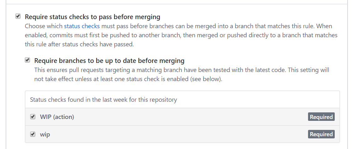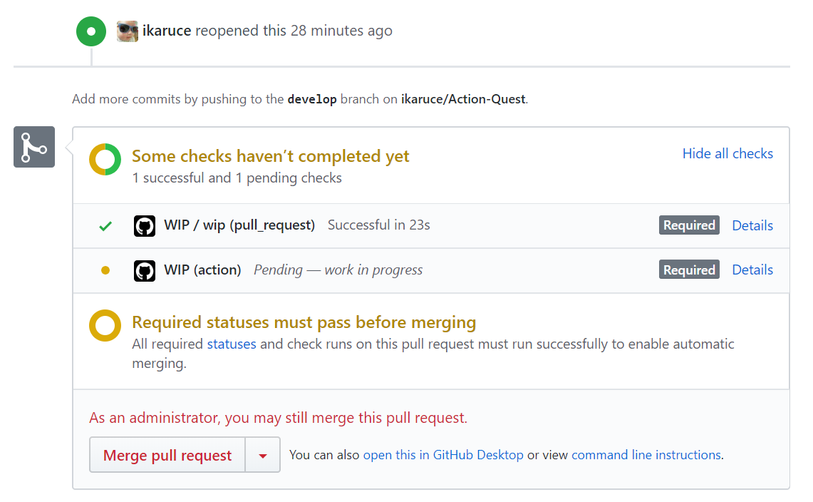 PR이 생성되고 나면 잠시 후, 작업 중이기에 Action이 진행되는 것을 확인할 수 있습니다. 그런데 Merge버튼이 그대로 활성화돼있는 것을 확인하고, 다시 Branch Protection Rule을 수정해 줍니다. 아까 생성한 규칙을 수정하려 와보면 WIP선택 옵션이 추가된 것을 보실 수 있고, 모두 선택해 주세요.