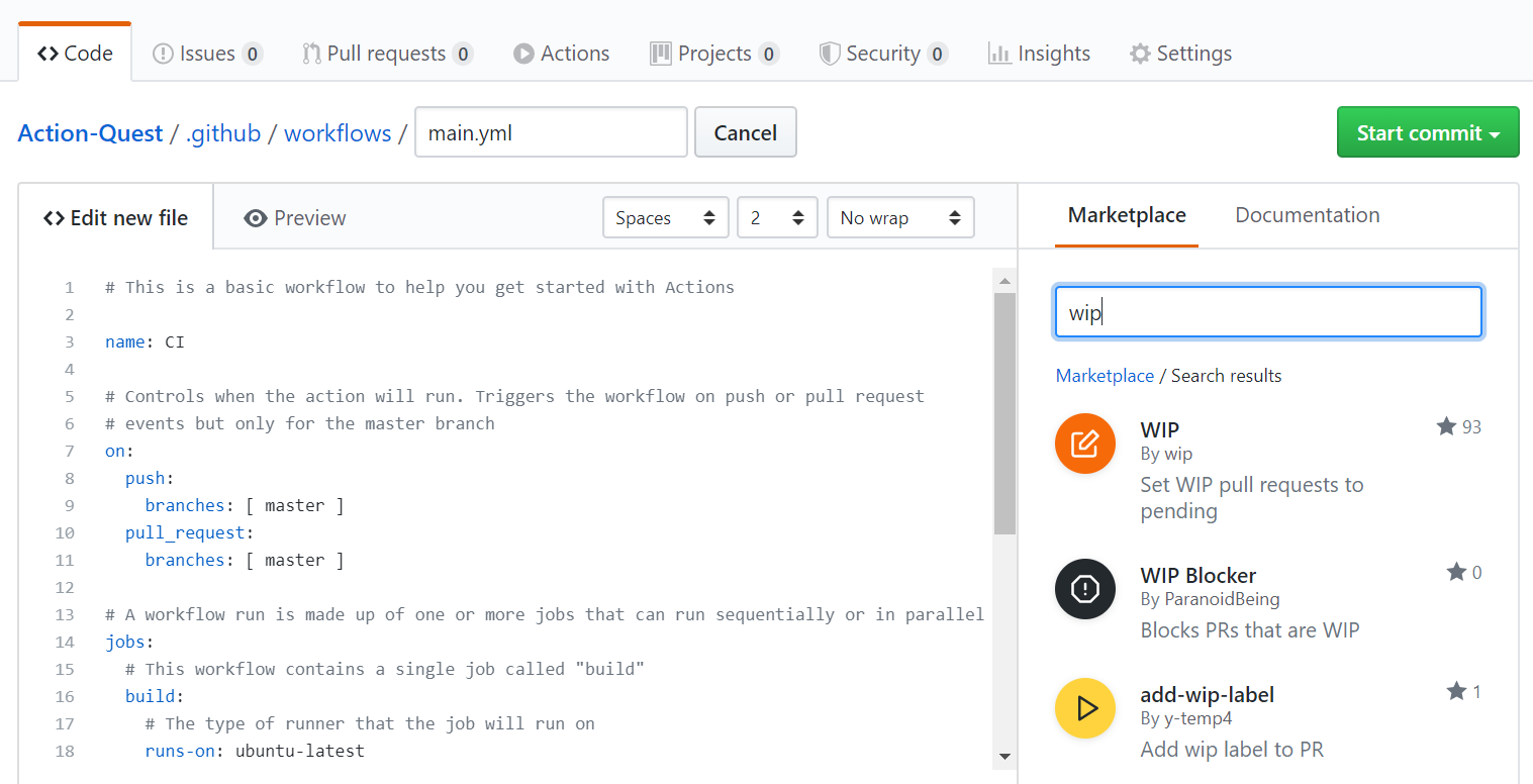 검색된 것 중 첫번째 WIP를 선택하고, View full Marketplace listing 링크를 클릭하여 이동합니다. 이후 나오는 코드를 복사하여 main.yml ( 파일명은 변경하셔도 됩니다. )에 적어 주고 커밋합니다.
