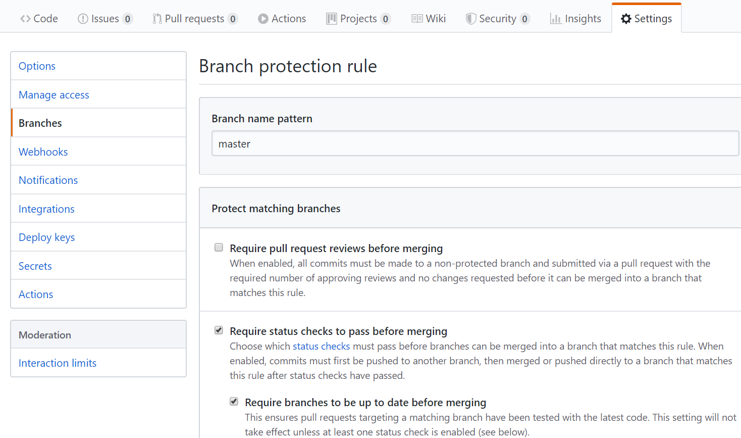 작업중인 branch가 Merge 되지 않도록 보호된 브랜치가 필요합니다. 무료 계정의 경우, public 리파지토리에서만 설정 가능합니다. Settings -> Branches -> Branch protection rules -> Add rule을 클릭하고 다음과 같이 설정해 줍니다.