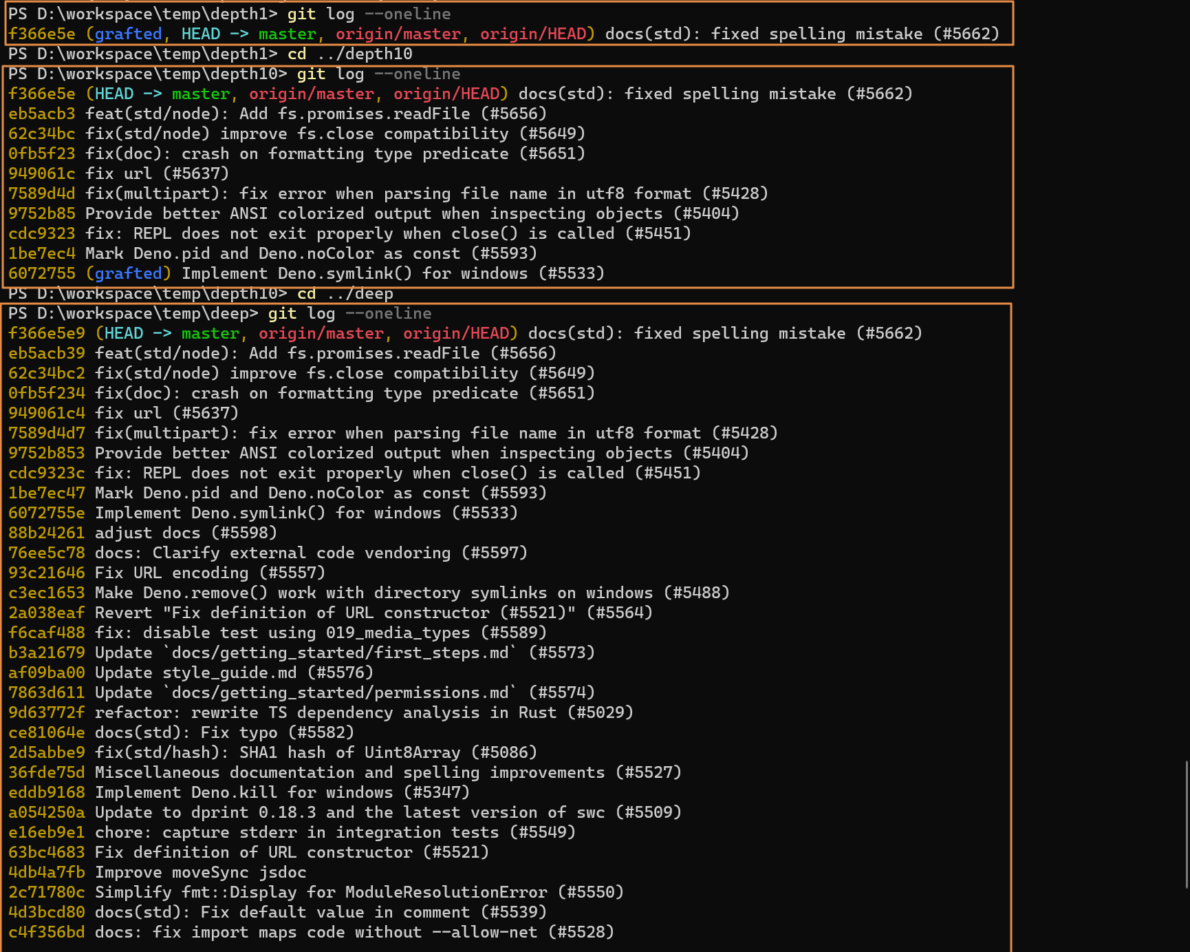 $ git clone --depth=10 https://github.com/denoland/deno.git
