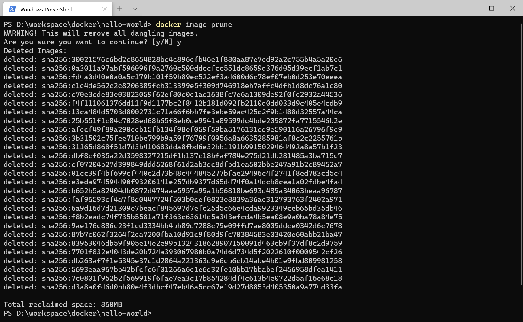 images가 아니고 image 임에 유의해야 합니다. ( 제가 자꾸 헷갈려해요 ) prune을 하고 나면 Dangling이미지 전체를 삭제한다고 하고 y라고 응답하면 모든 이미지를 삭제합니다. 아까 만들었던 이미지 중 860Mb가 삭제되었습니다. 929Mb가 삭제되어야 하지 않냐고 의문을 가질 수 있지만 docker-hub로부터 내려받은 hello-world:latest 이미지도 debian:buster-slim이미지와 관계가 있기 때문에 그 용량을 빼면 ( 929-69= ) 860Mb만 삭제되는 것이 이해가 될 것입니다.