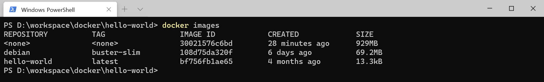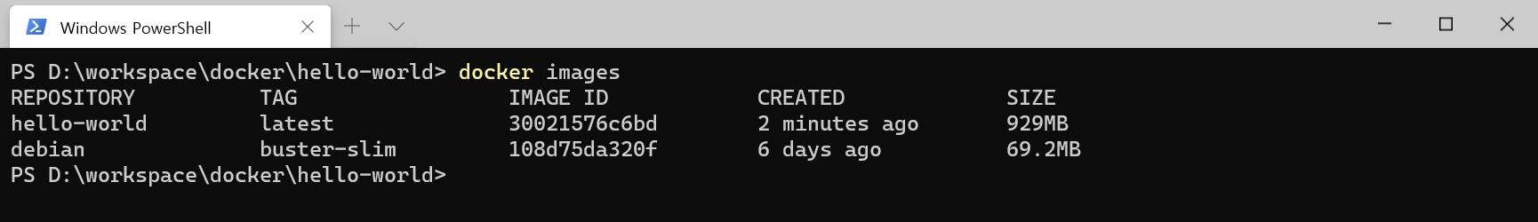 빌드가 완료되면 hello-world 이미지가 만들어진 것을 확인할 수 있습니다.