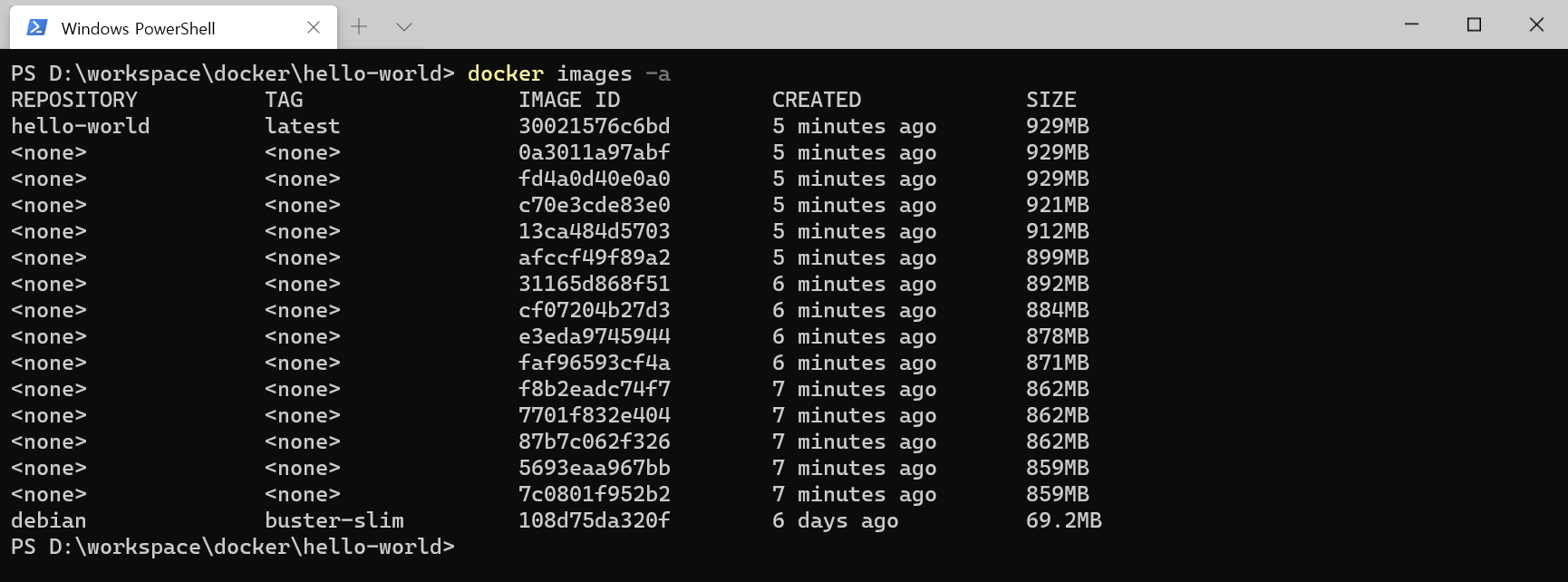 도커 이미지는 여러개 레이어로 이루어져 있는데, 이 레이어는 서로가 층층이 쌓인 관계를 가집니다. 그리고 이 레이어는 graph 데이터베이스에 저장됩니다. 방금 만들어진 hello-world:latest 이미지는 debian:buster-slim 이미지를 시작으로 16개의 레이어로 이루어진 것을 알 수 있습니다. 여기서 <none>:<none> 이미지들은 hello-world를 만들기 위한 중간 이미지( intermediate image )로써, 이미지를 만드는 과정( 또는 docker pull을 통해서 받아오는 과정 )에서 만들어집니다. 실제로 역할을 하지는 않고, Disk를 차지하지도 않지만, 눈에 거슬리고, ID가 다른데도 이미지명과 태그가 동일하기에 구별도 되지 않습니다.