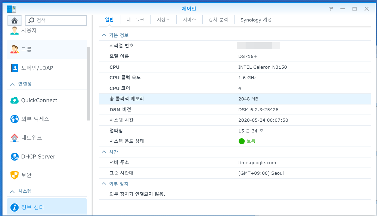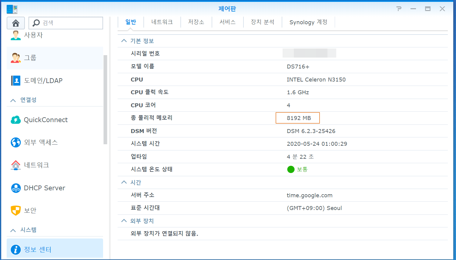 다시 NAS에 접속하여 정보를 확인해보니, 8GB로 잘 인식되는걸 확인할 수 있었습니다.