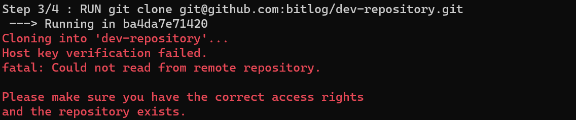 언제나 그렇드시 순탄하게 실행이 되지는 않습니다. ssh를 이용하여 처음 클론을 받게 되면 host의 정보를 묻고, 그 host의 정보를 저장하는 단계를 거치게 되는데요. 단순히 예/아니요를 묻는 것이지만 Docker 이미지를 만드는 중에는 그런 프롬프트를 사용할 수 없으므로, Docker 이미지를 만드는 데는 실패하게 됩니다.