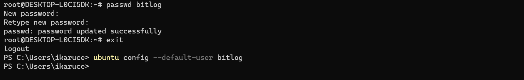 3. 패스워드를 변경합니다. 저는 bitlog라는 계정을 사용하니, "$ passwd bitlog" 라고 명령을 입력합니다. 그리고 ubuntu를 종료하고, 기본 사용자를 원래 대로 돌려놓습니다.