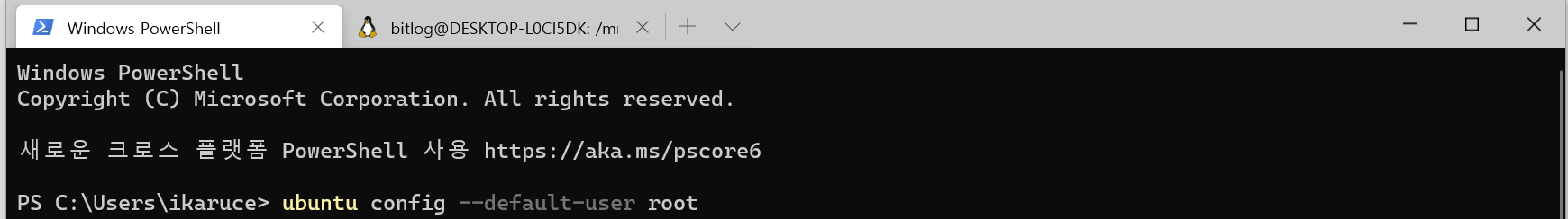 1. 윈도우 터미널( powershell 또는 cmd )에서 ubuntu 의 기본 사용자를 변경합니다.