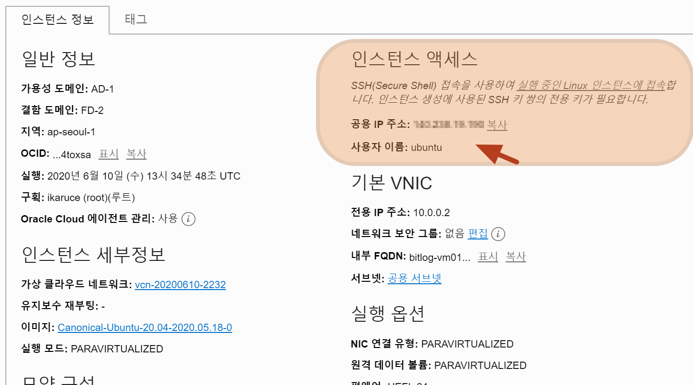 VM이 생성되고 나면, IP와 계정을 확인할 수 있는데, 아까 입력한 ssh 키를 통해서 인증됩니다. IP만 보지마시고 사용자 이름이라고 쓰여 있는 것도 잘 보세요.