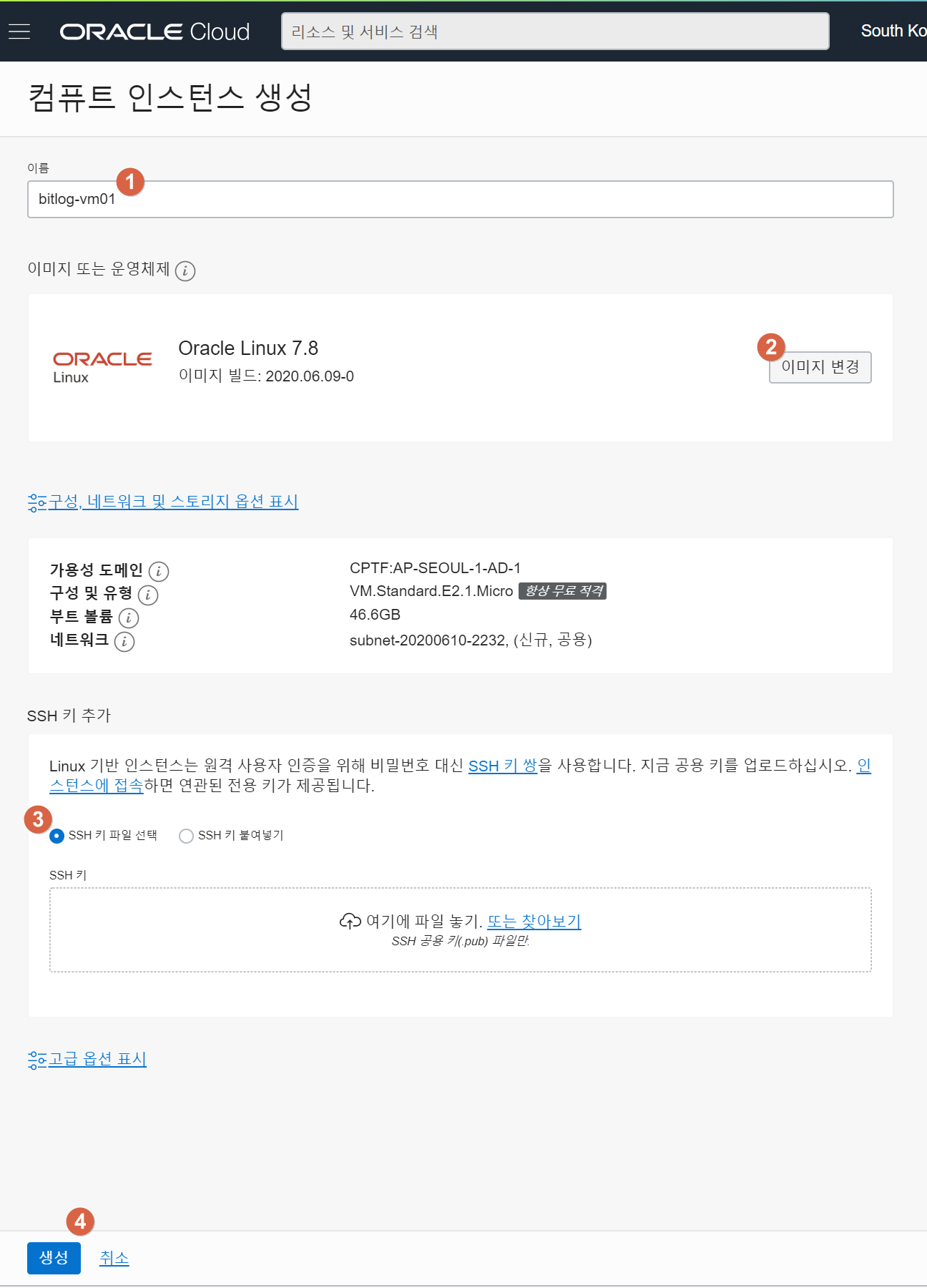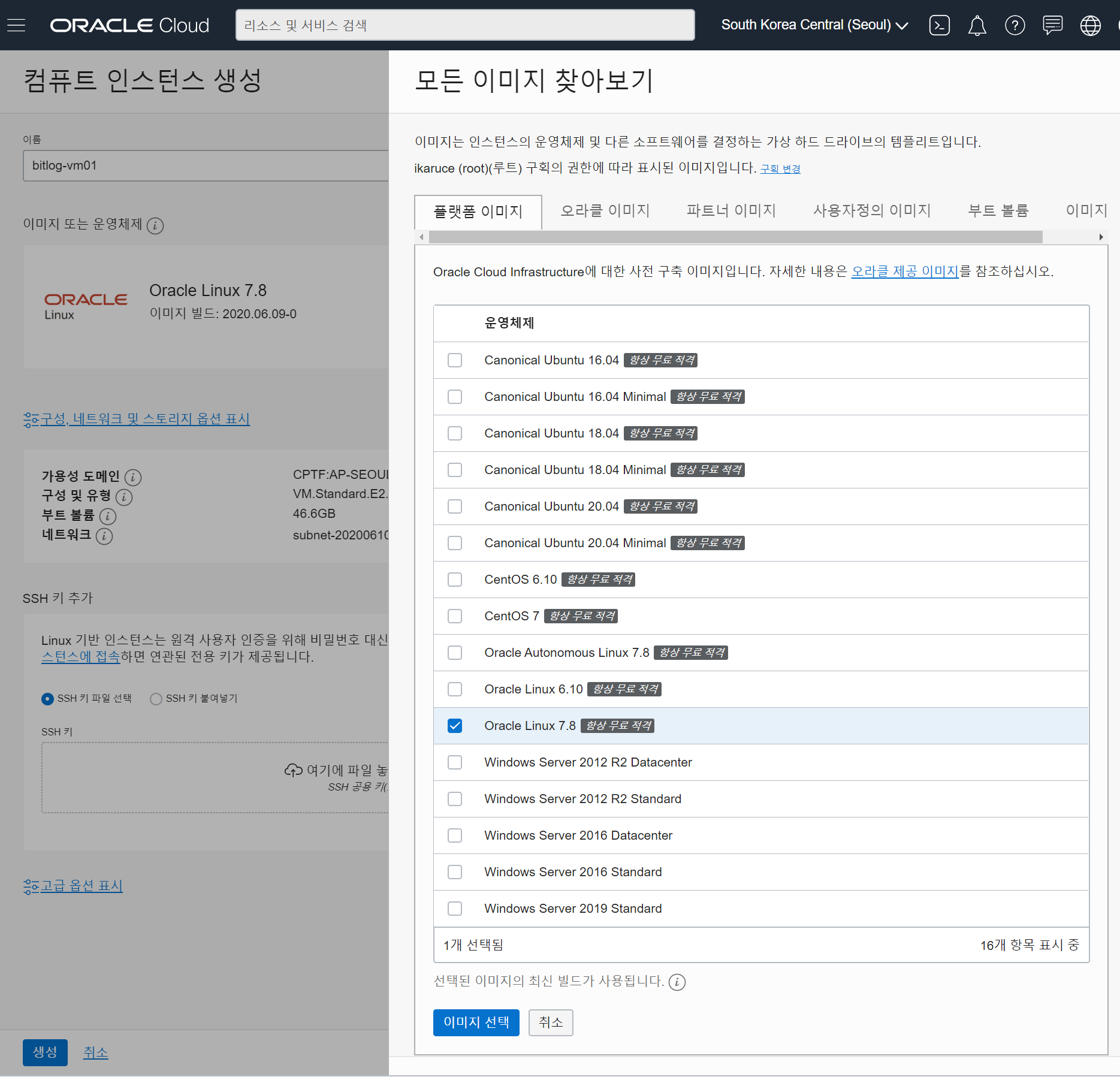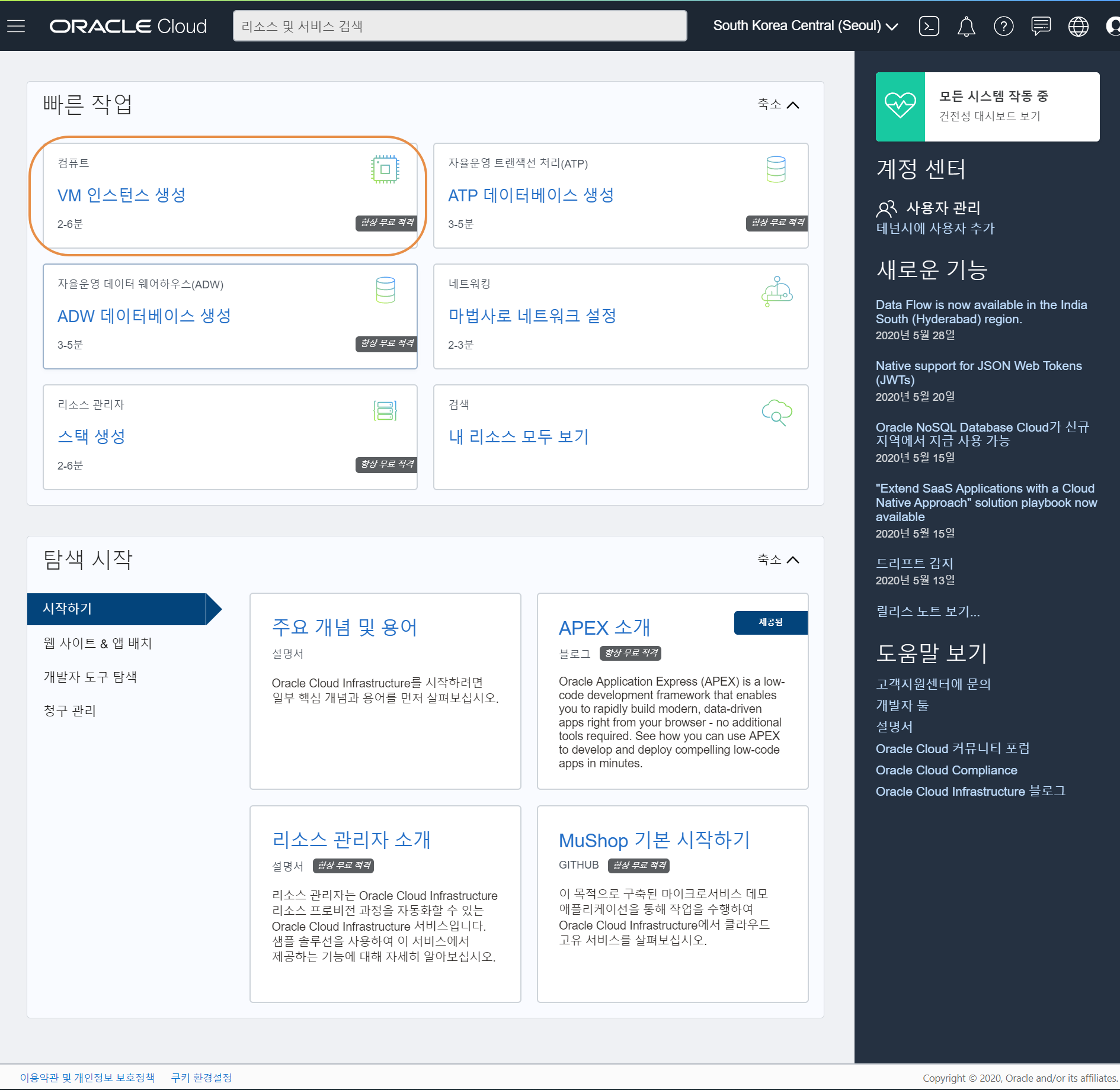 무료 티어에서 생성할 수 있는 인프라 총량의 정해져 있어, 제한에 다다를 경우 인스턴스 생성이 되지 않고 한국 특히 서울은 생성하기 어렵다고 들었어서 오늘 마치지 못할 수 도 있다고 생각했는데, 바로 생성이 되었습니다. 클라우드 후발 주자로써 인지도를 높이고 사용자를 많이 끌어들이려는 목적일 것이라 생각되지만, 무료 인스턴스를 제공해 준다는 것은 참 고마운 일입니다. 그리고 한 10여분 정도만 투자해서 평생 무료 서버가 생기니 하나씩 만들어 두시는 것은 어떨까요?