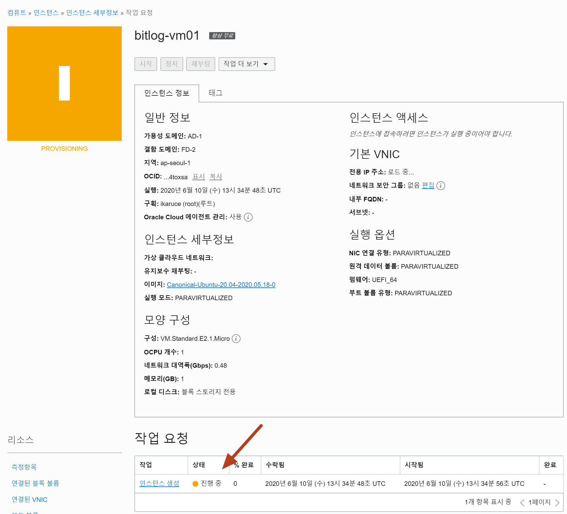 마지막으로 생성 버튼을 누르면 인스턴스가 생성되는 것을 확인할 수 있습니다. 이제 기다리면 됩니다.