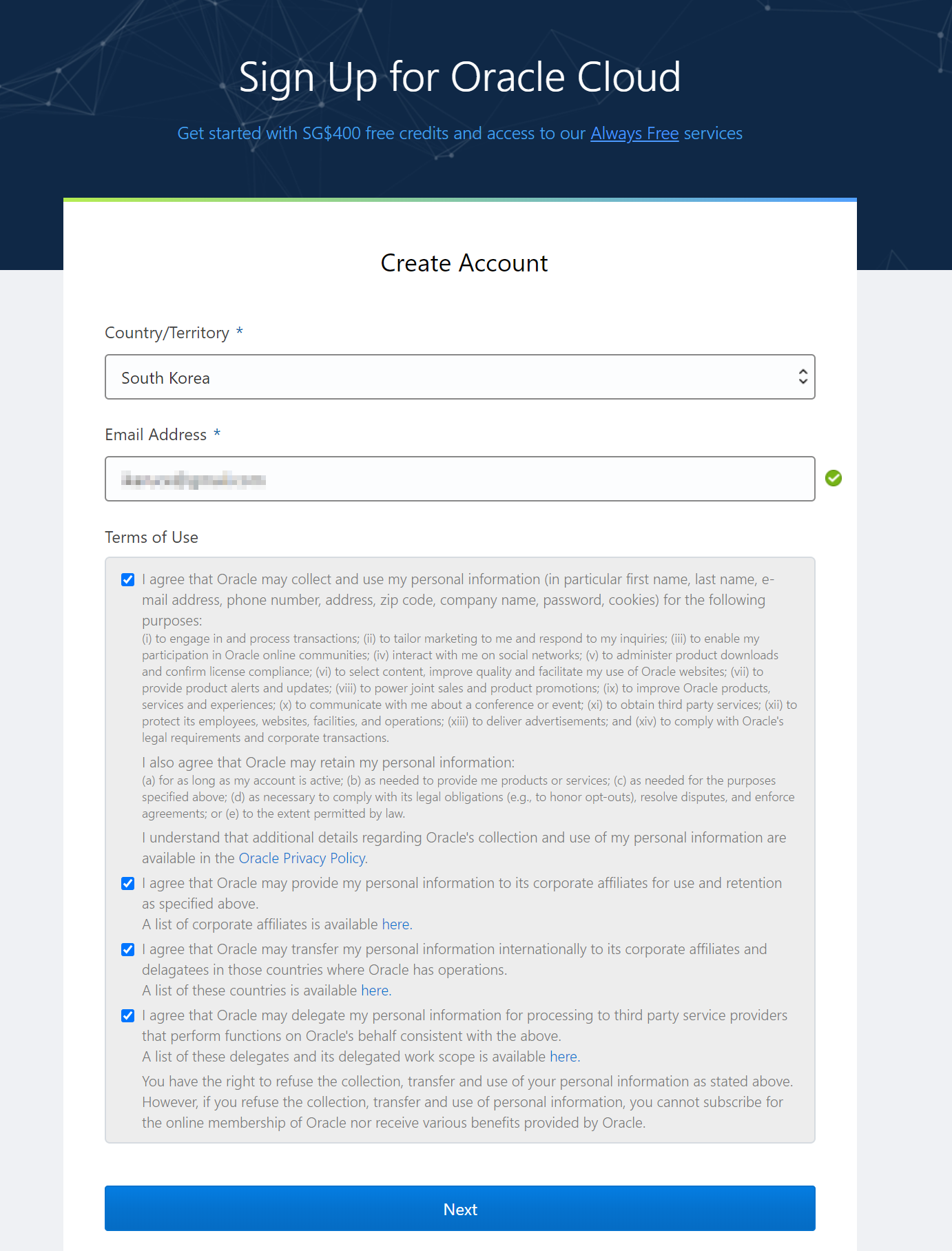 4가지의 개인정보 사용 동의를 하고 Next 버튼을 누릅니다.