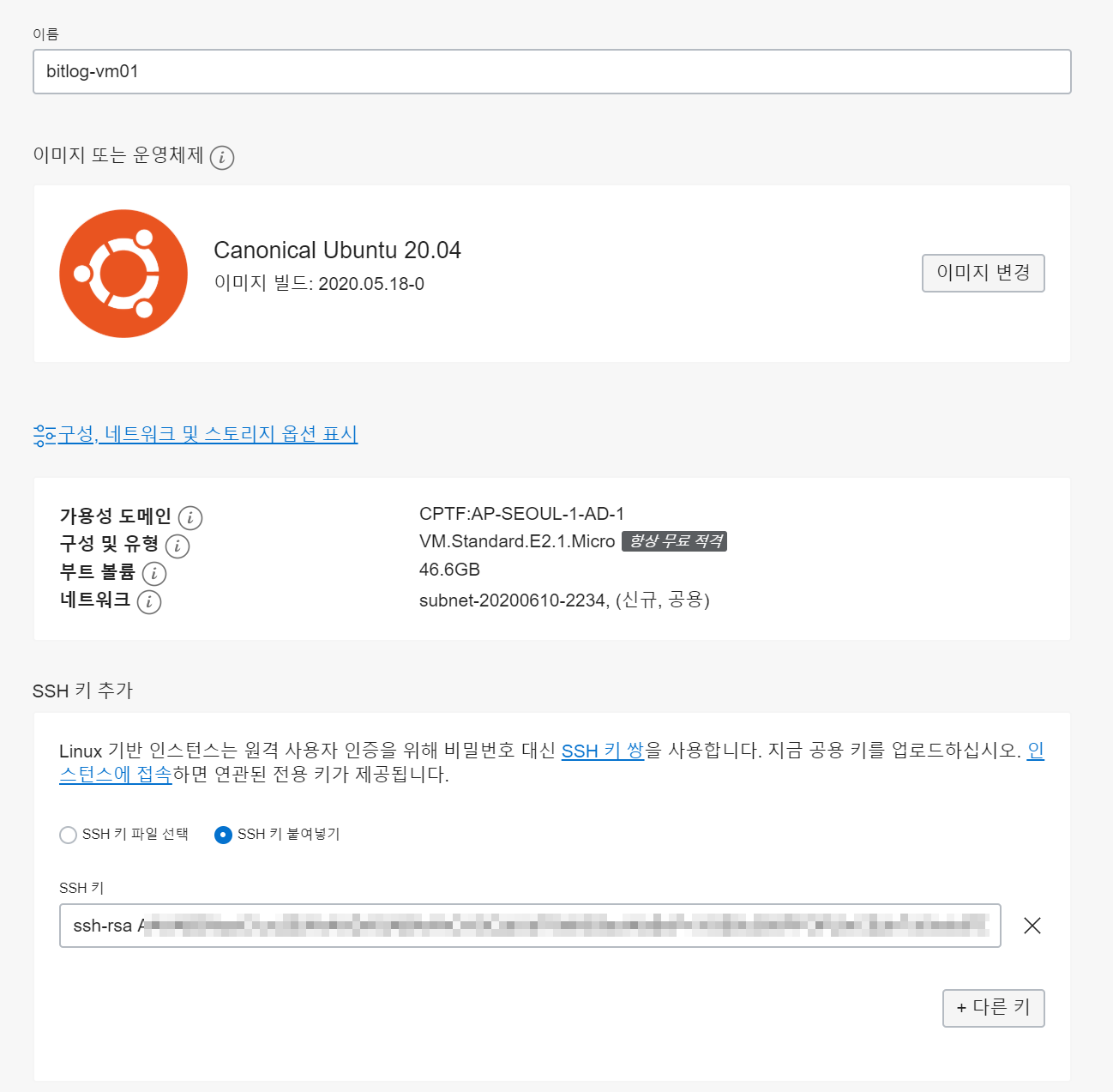 이미지를 선택하고 SSH키 파일도 넣어주면 생성할 준비는 끝나게 됩니다. 이때, SSH 키를 정확하게 입력하지 않으면 VM에 접속할 수 없으니 정확한 키를 입력해 주셔야 합니다. 물론 리세마라를 해도 됩니다.