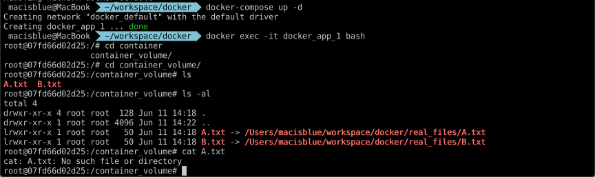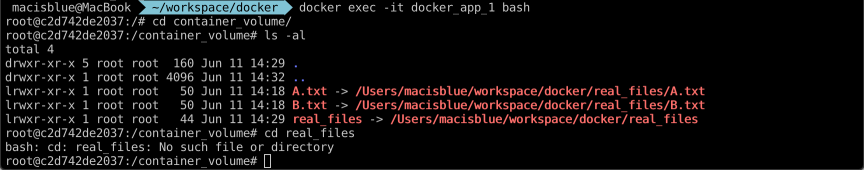 컨테이너 볼륨에는 파일이 보이지만, 파일을 사용할 수는 없었습니다. Symbolic 링크가 걸려있기는 하지만, host의 경로가 걸려있기 때문에 컨테이너에서는 사용할 수 없는 상태였습니다. 이렇게는 사용할 수 없었습니다.