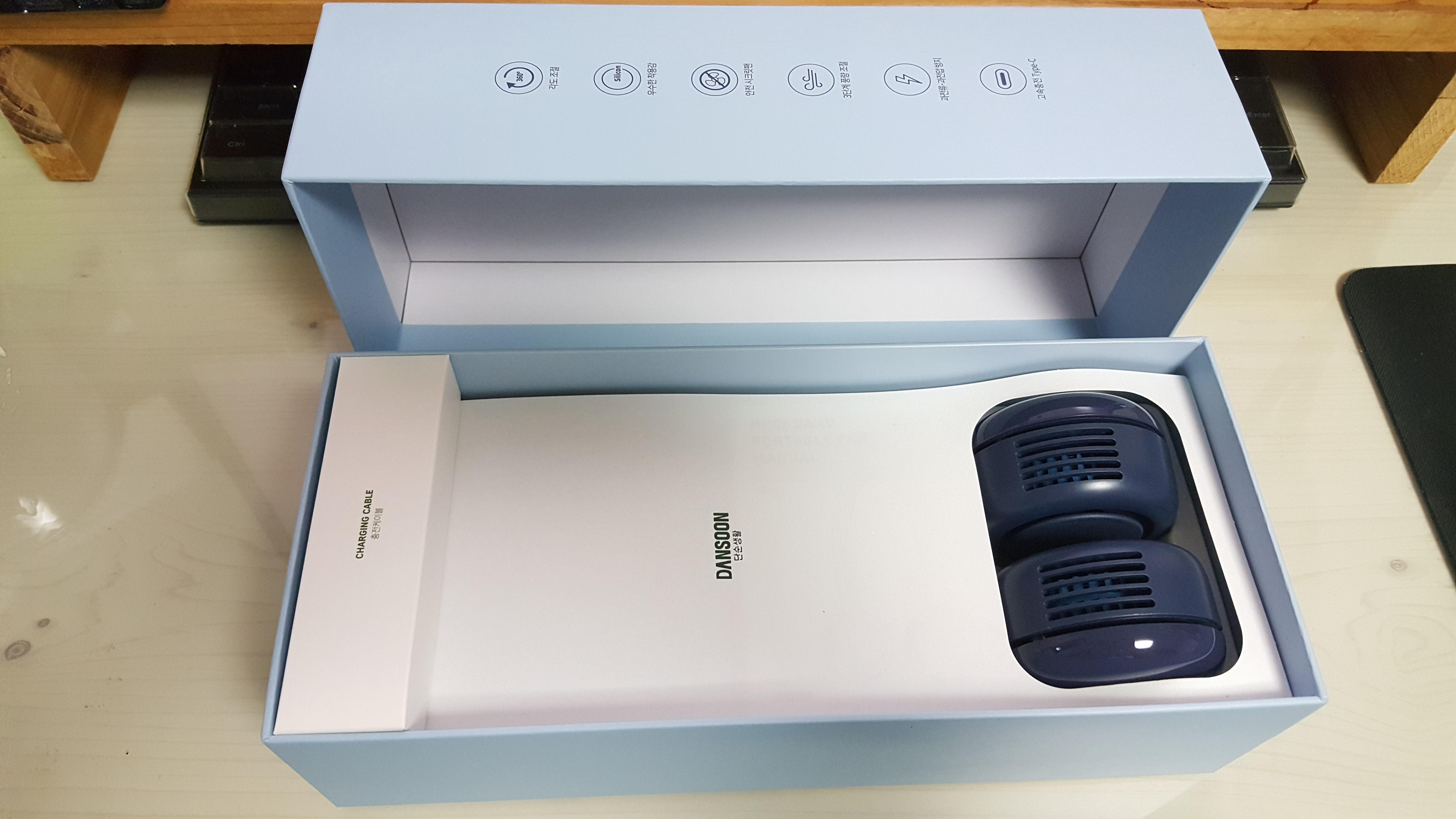 상자를 열면 바람이 나오는 구멍이 도드라지게 눈에 띄이도록 되어 있고, 왼쪽의 작은 상자에 USB-c타입 충전 케이블이 들어있습니다. (충전기는 따로 없습니다) 휴대형 선풍기들이 micro-5 pin을 사용하는 경우가 대부분인데, usb-c로 충전한다는 점은 좋은 것 같습니다.