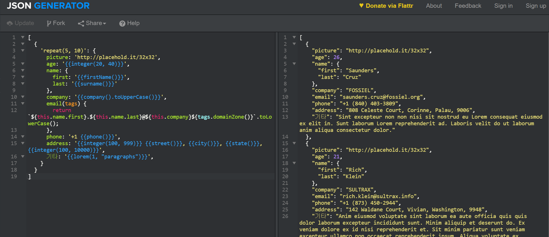 생성되는 데이터는 불리언, 도시, 회사, 지역, 날짜, 도메인, 이름, 유리수, 정규분포, guid, 인덱스, 정수, 임의의 문장(lorem Ipsum), 몽고DB의 ObjectID, 전화번호, 임의의 난수, 범위, 특정 문자열 반복, 주, 거리이 있습니다. 도시나, 지역, 거리명은 미국의 데이터를 생성하는게 조금 아쉽지만, 이 사이트를 이용하면 손으로 만들 때보다, 더 그럴듯한 데이터를 빠르게 만들 수 있습니다. 그리고 원하는 데이터를 직접 만들 수 있도록 함수도 사용할 수 있습니다.